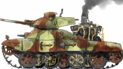 友邦独国の王虎戦車(ポルシェ砲塔)の技術協力を得た世界線の和風蒸気戦車 ちなみにチハの試作車や、チリの検討段階で千鳥転輪は和戦車にも取り入れられているらしい。 ボイラーは水管式で艦本式に似たやつ。
