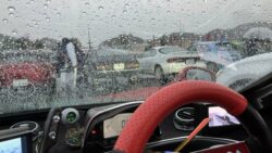 ポルシェ 入場待ち。 かなりの雨だけどクラシックな車も多数参戦。 後ろはスーパー7と930ポルシェ、気合い入っとる。 いかにもなデモラン用っぽいヤリスも入場♪ ゼッケン20で出走です!
