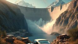 ポルシェ ポルシェは小高い丘の上で停車した。アスファルトで舗装された駐車場はあるが、建物は何もない。何かの跡地だろうか。そこからダム湖と、ばかでかいダムと、その下流に続く峡谷が見下ろせる。